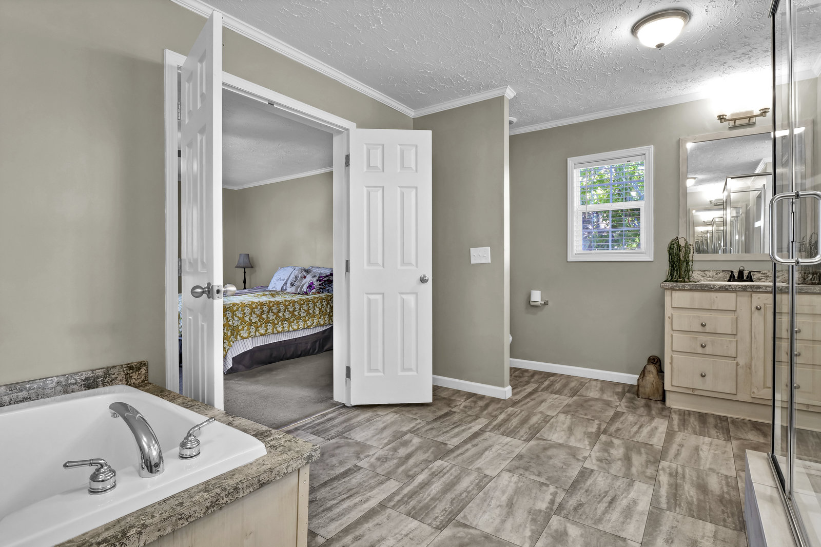 The primary suite is a sanctuary for daily life, boasting a garden tub, a beautifully tiled walk-in shower, and dual walk-in closets. These features combine to offer a private retreat for relaxation and rejuvenation.